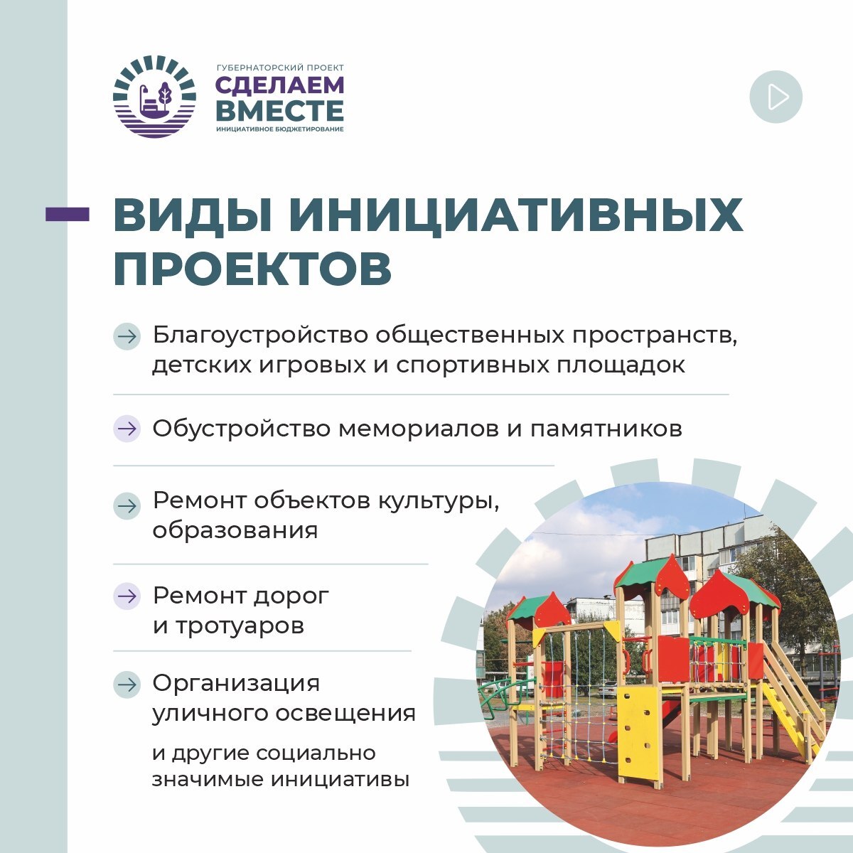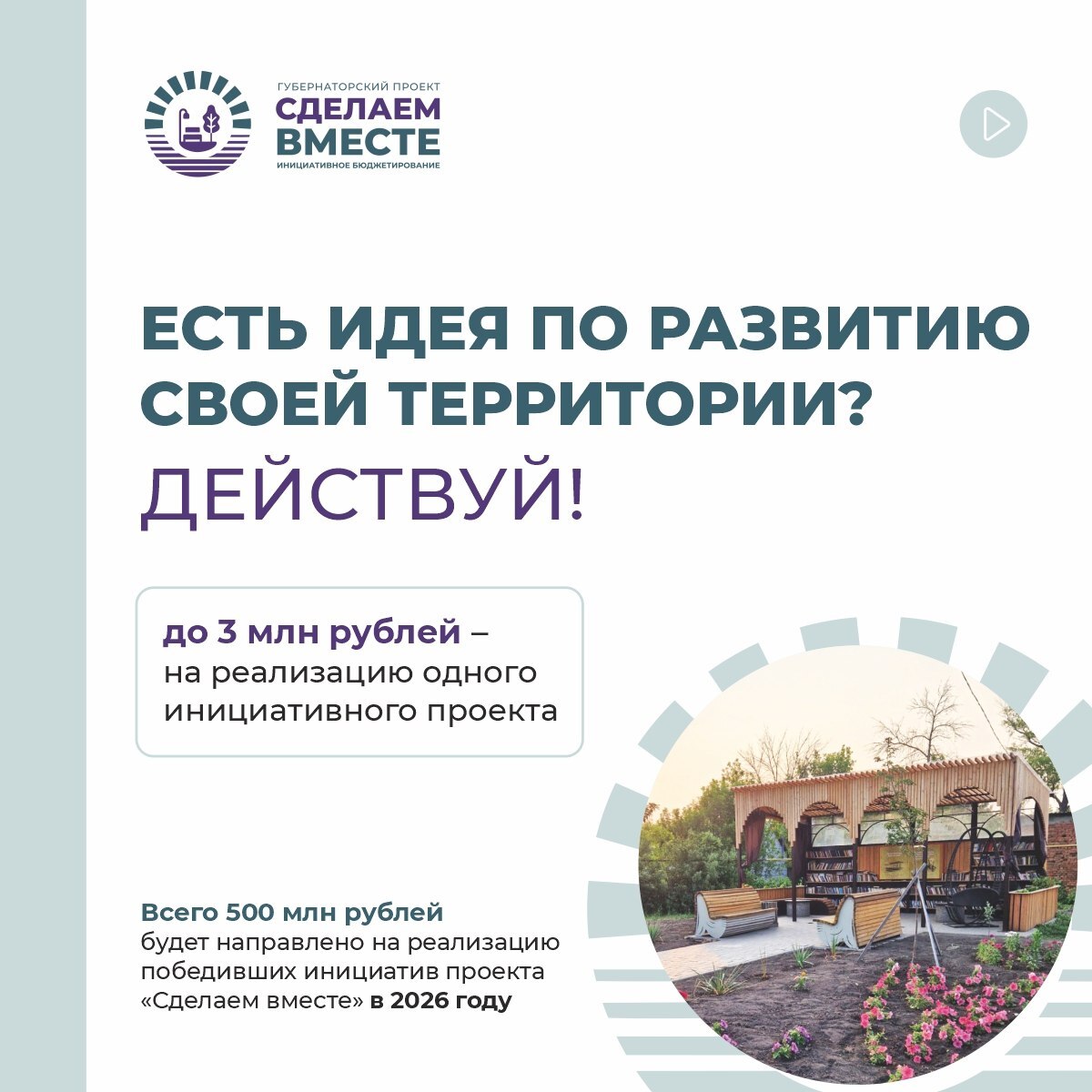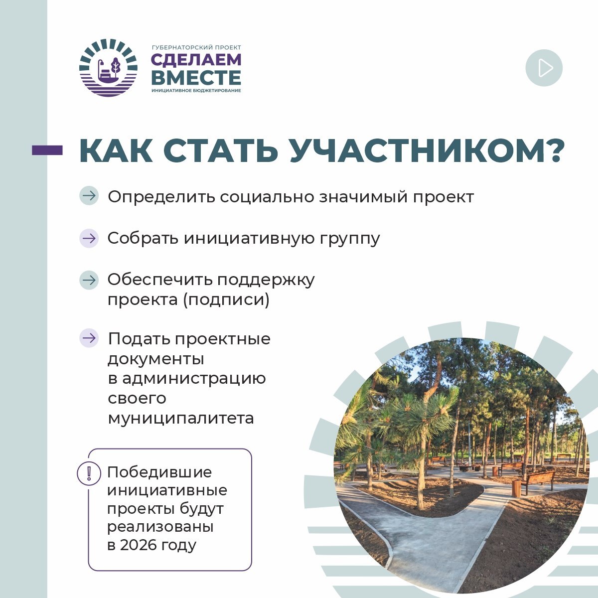 Любой житель может выдвинуть инициативу по развитию своей территории. Для этого необходимо собрать инициативную группу, обеспечить общественную поддержку своего проекта и подать документы в администрацию своего муниципального образования до 31 августа.