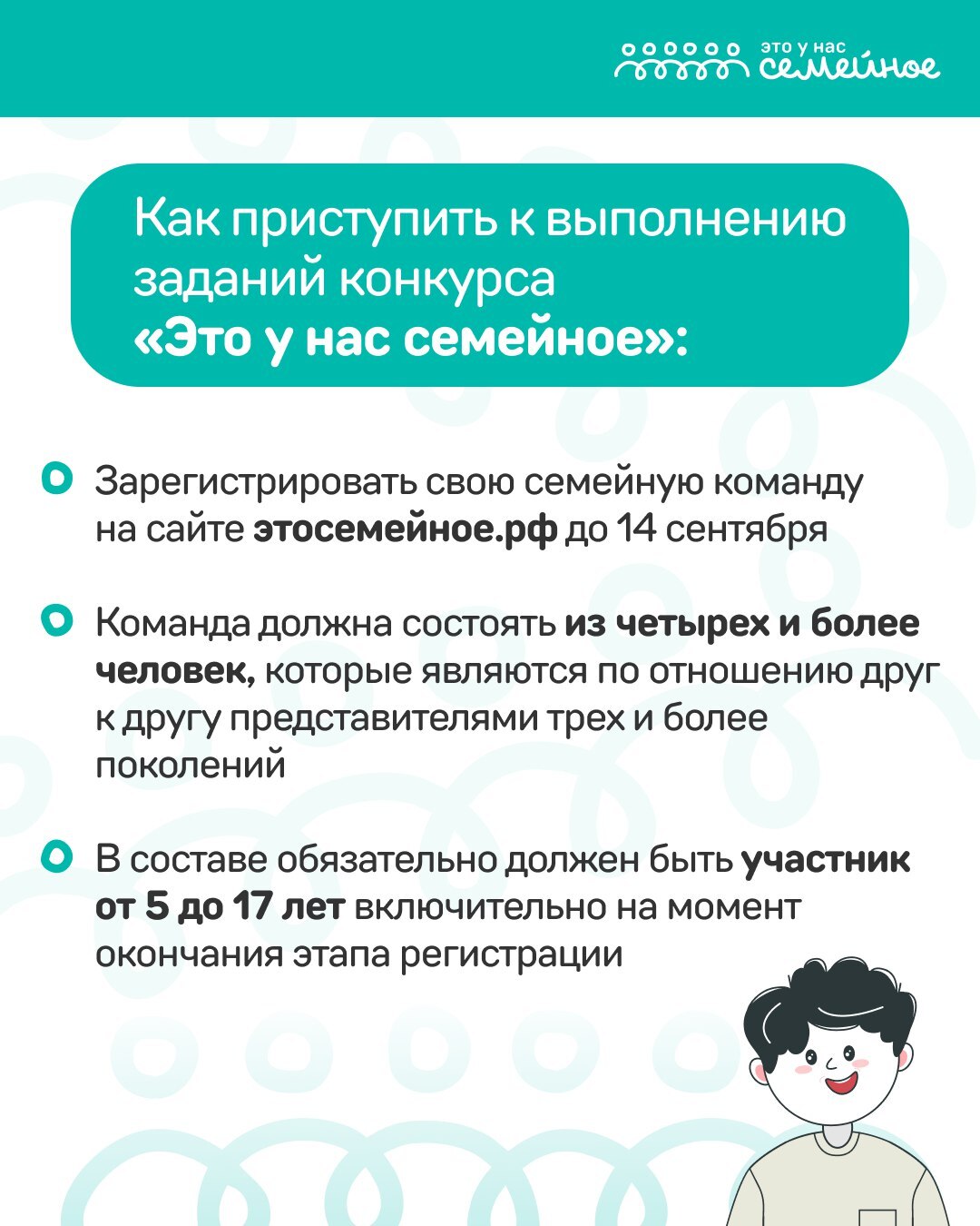 Сейчас продолжается дистанционный этап. Задания необходимо выполнить до 1 октября. А затем участников ждет викторина на знание истории и культуры России. Семьи, набравшие наибольшее количество баллов на дистанционном этапе, – выйдут в полуфинал.