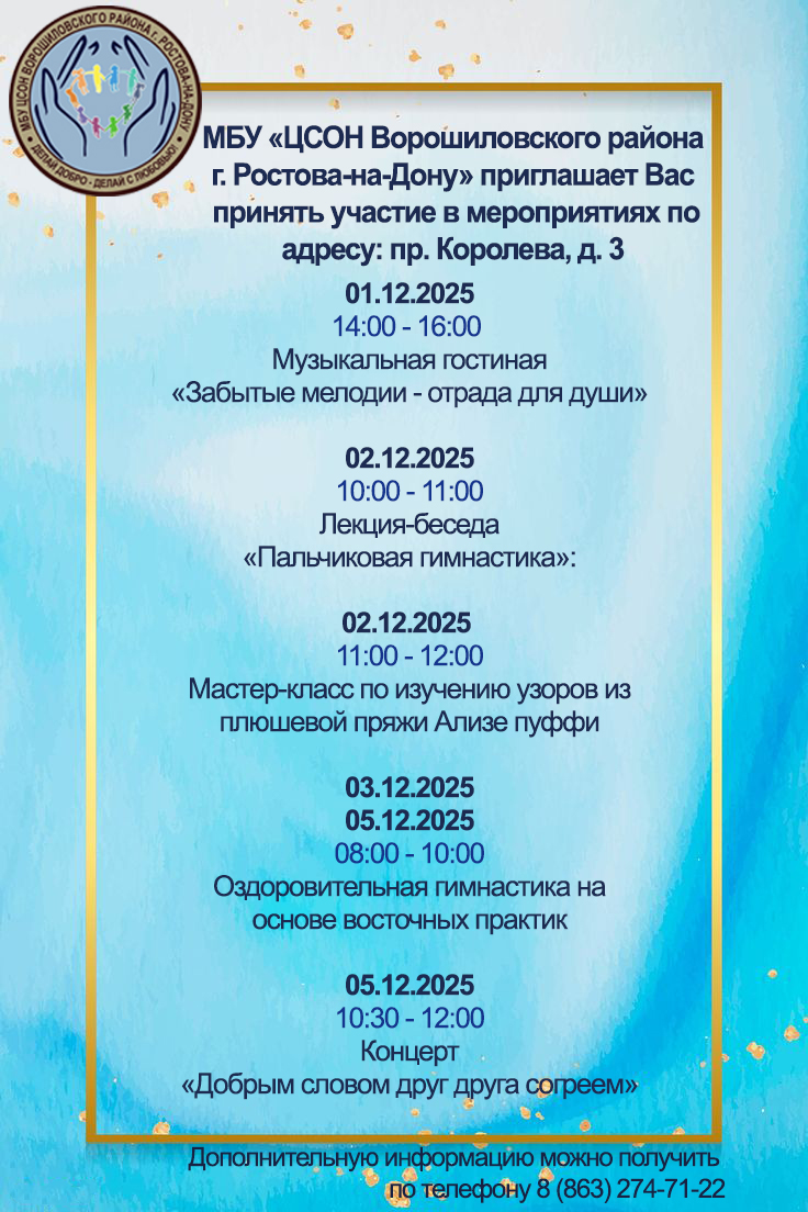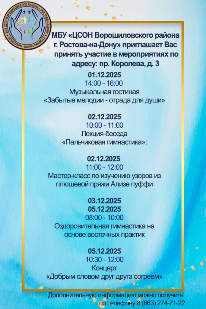 МБУ «ЦСОН Ворошиловского района г. Ростова-на-Дону» приглашает Вас к участию в мероприятиях! Расписание