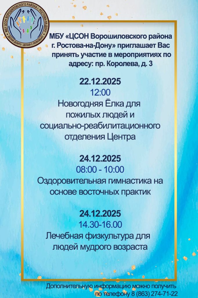 МБУ «ЦСОН Ворошиловского района г. Ростова-на-Дону» приглашает Вас к участию в мероприятиях! Расписание